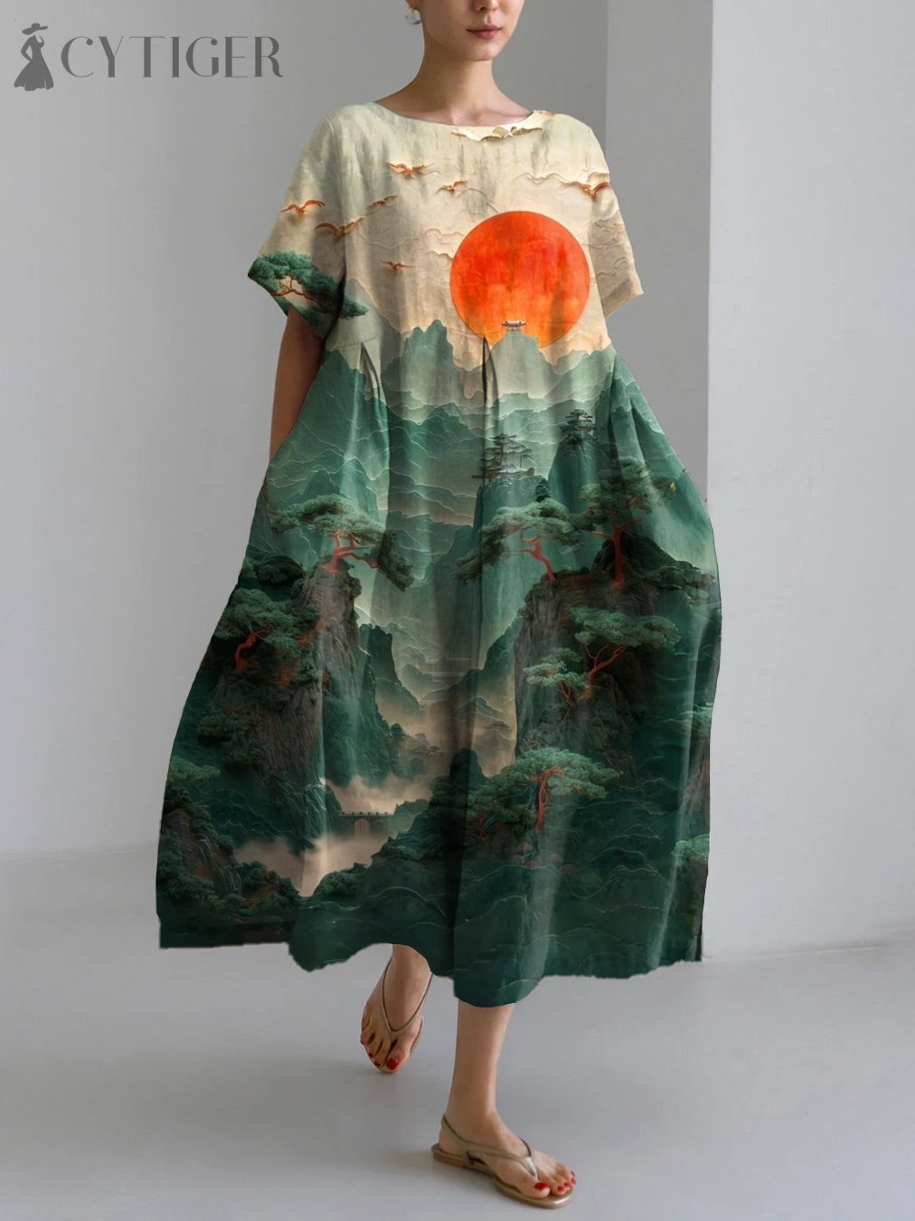 Asian Art Mountain Peak Print Linen Blend Maxi Dress