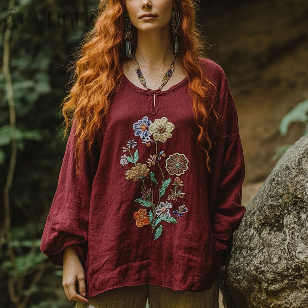 Bohemian Holiday Style Vintage Embroidered Print Casual Long-sleeved Top