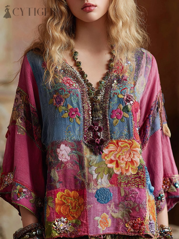 Bohemian Patchwork Multi-colored Floral Embroidery Pink V-neck Short-sleeved Shirt