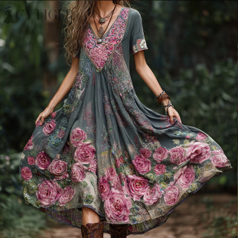 Bohemian Style Three-dimensional Embroidered Rose Diamond Embellished Color-block Dreamy Pink-green Vintage V-neck Slim Short-sleeved A-line Long Dress