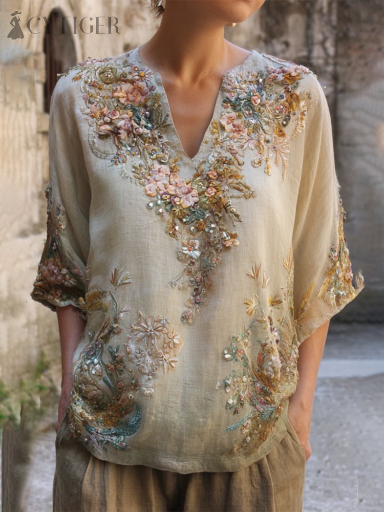 Bohemian Style Three-dimensional Small Floral Sequin Casual Vintage Silent Green Short-sleeved Shirt