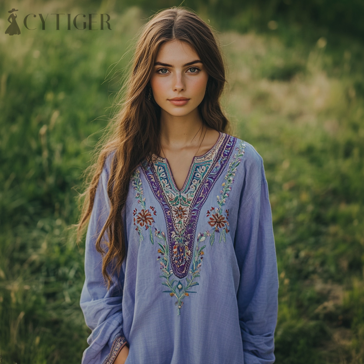 Boho Purple Floral Embroidery Linen Blend Loose Blouse