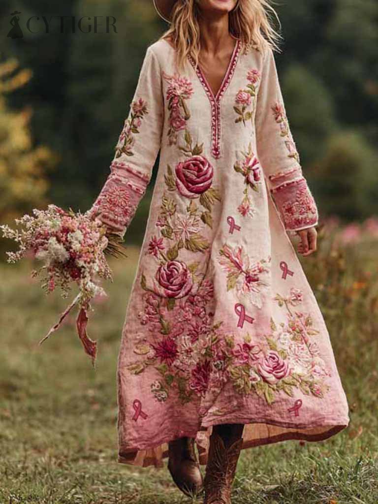 Classy Classy Gradient Pink Roses Cancer Awareness Ribbon Embroidered Linen Maxi Dress