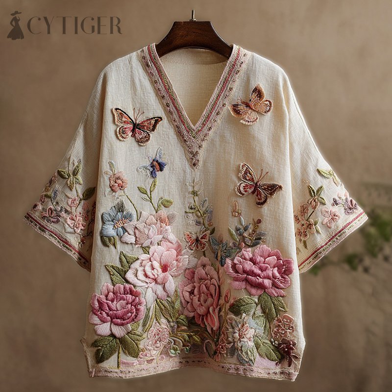 Cozy Pink Floral Butterfly Embroidery Short Sleeve Linen Three-quarter Sleeves Shirt