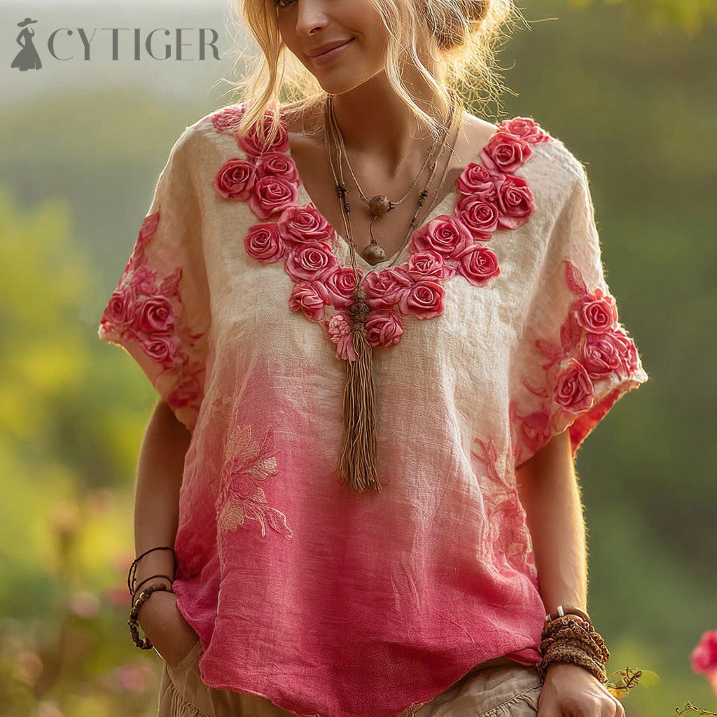 Cozy Pink Rose Gradient Art Short Sleeve Linen Blend T-shirt