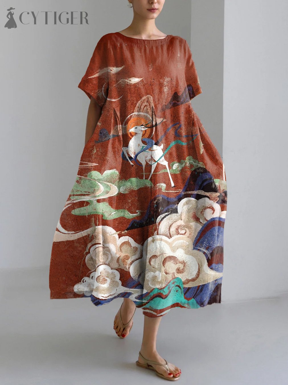 Deer Asian Art Print Linen Blend Maxi Dress
