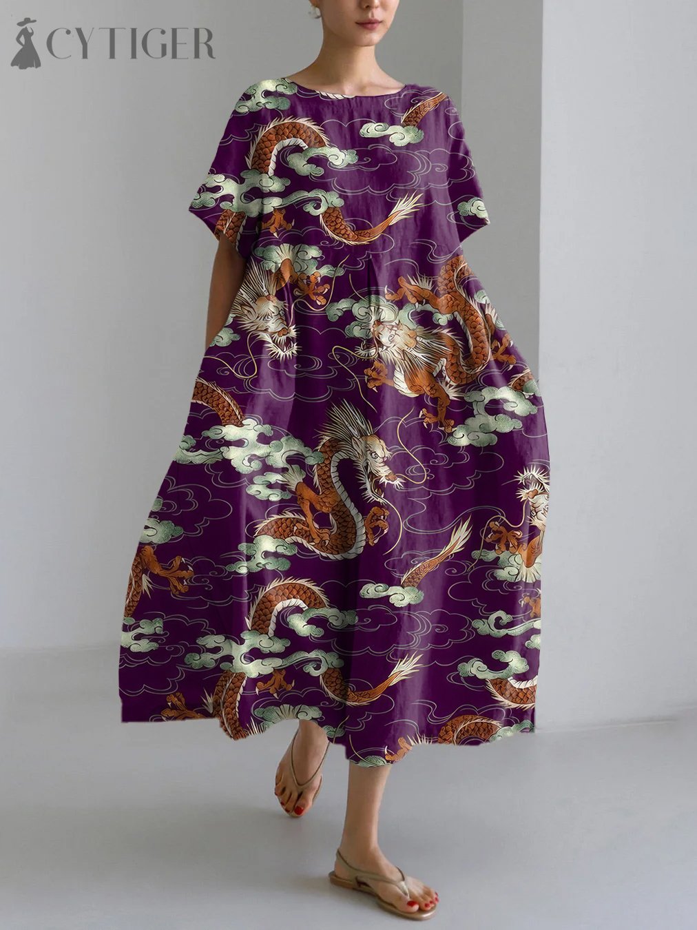 Dragon Asian Art Print Linen Blend Maxi Dress