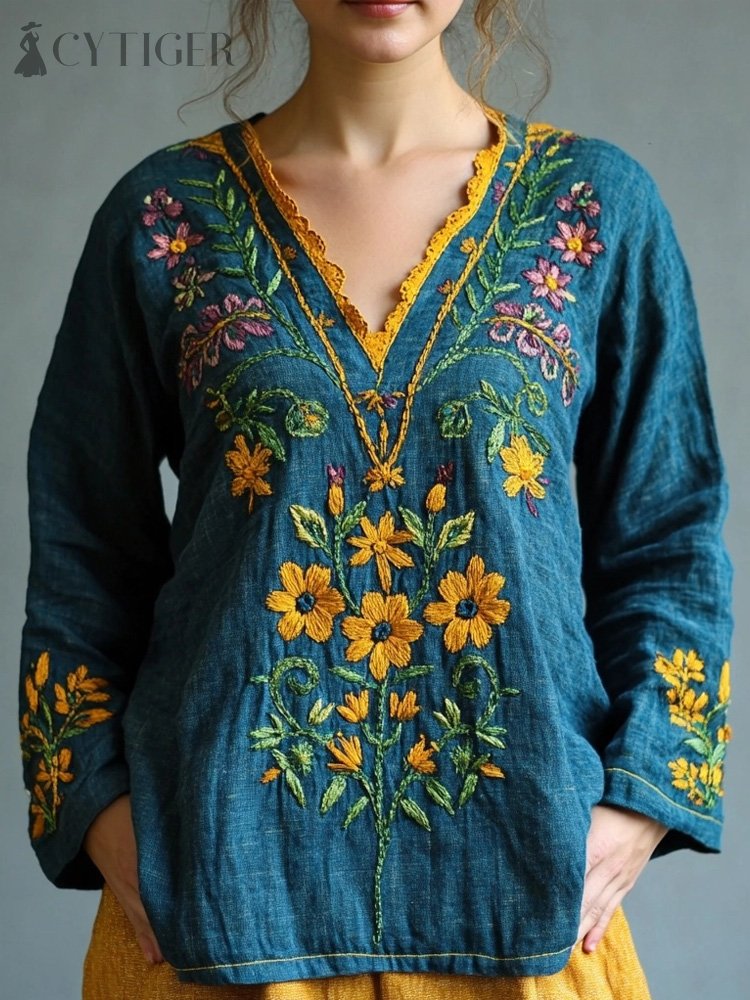 Vintage Floral Embroidered V Neck Linen Blend Tunic