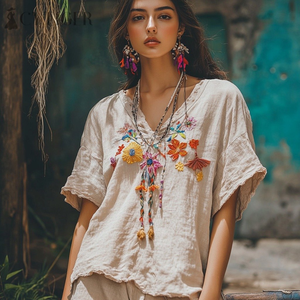 Women's Floral Embroidery V Neck Casual Linen Top