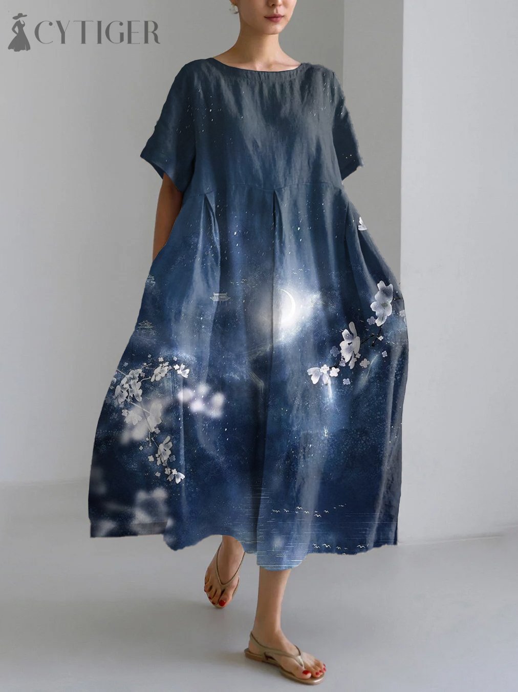 Japanese Art Floral Print Linen Blend Maxi Dress