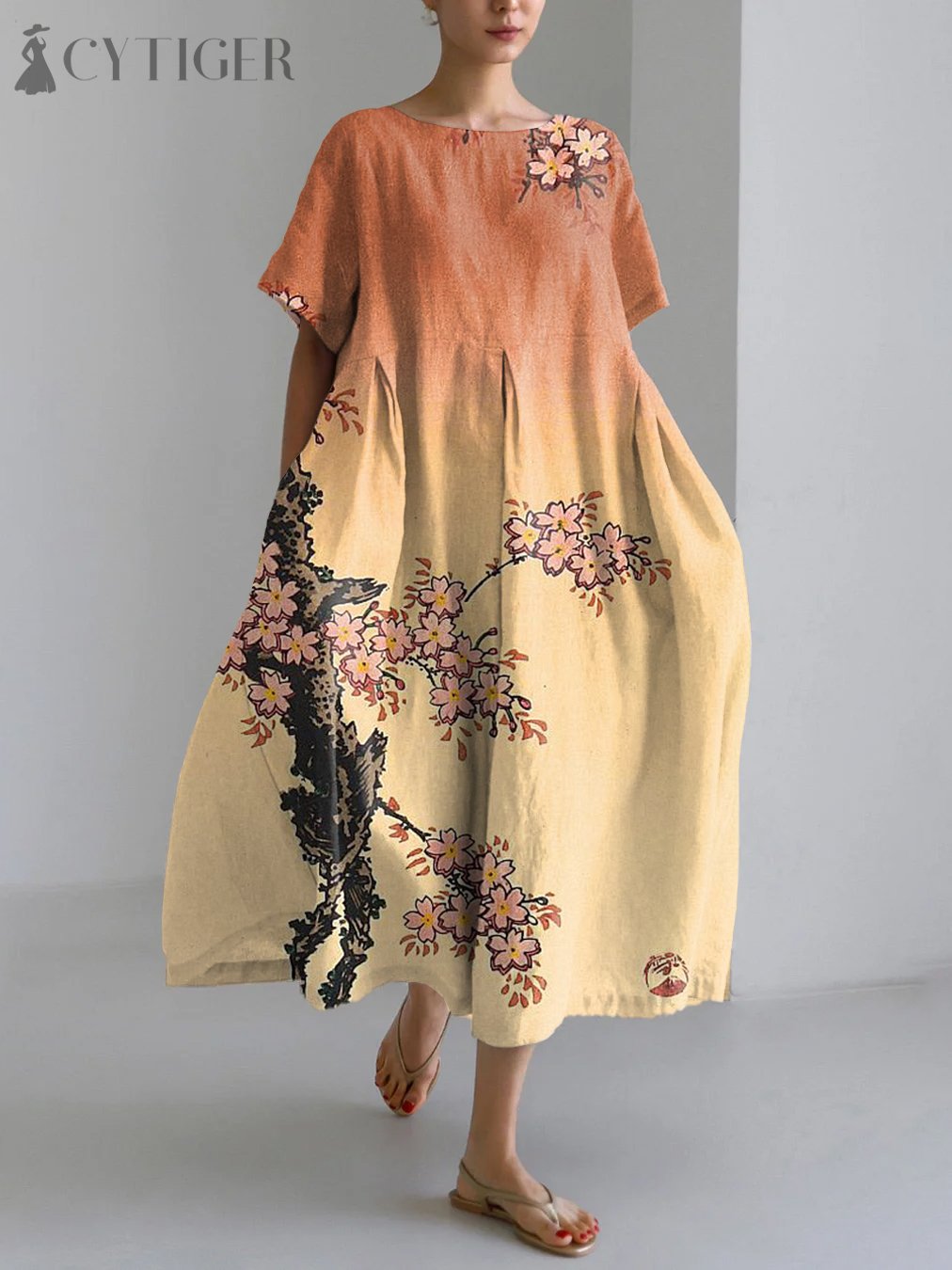 Japanese Art Floral Print Linen Blend Maxi Dress