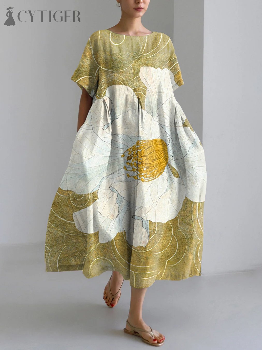 Japanese Art Flowers Print Linen Blend Maxi Dress