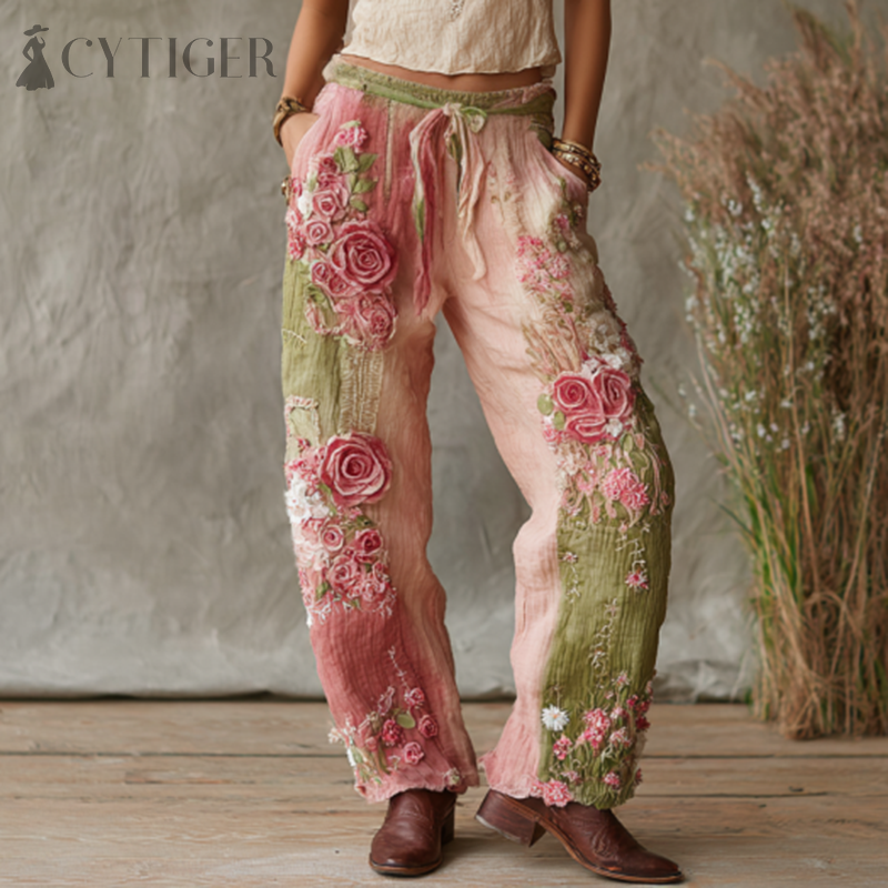 Love & Health Collection Retro Western Women Style Vintage Rose And Floral Patchwork Art Linen Pants