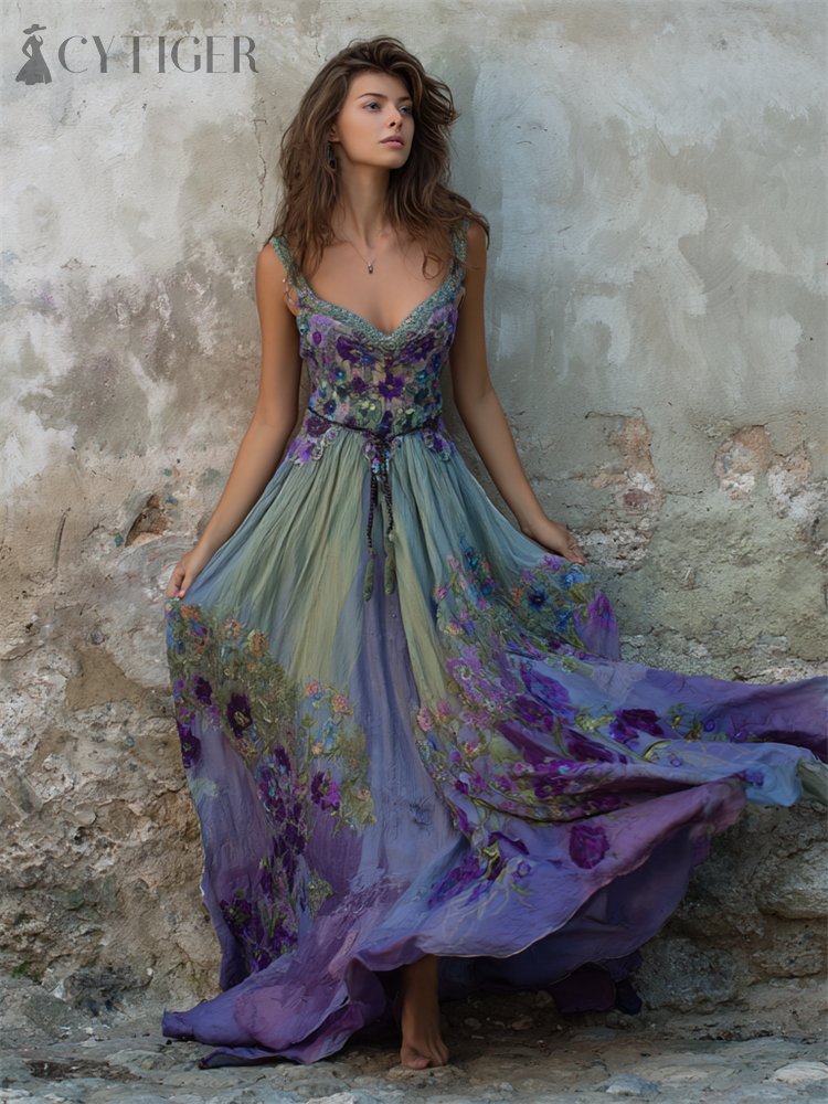 Classy Floral Embroidered Purple Gradient Flowy Linen Maxi Dress
