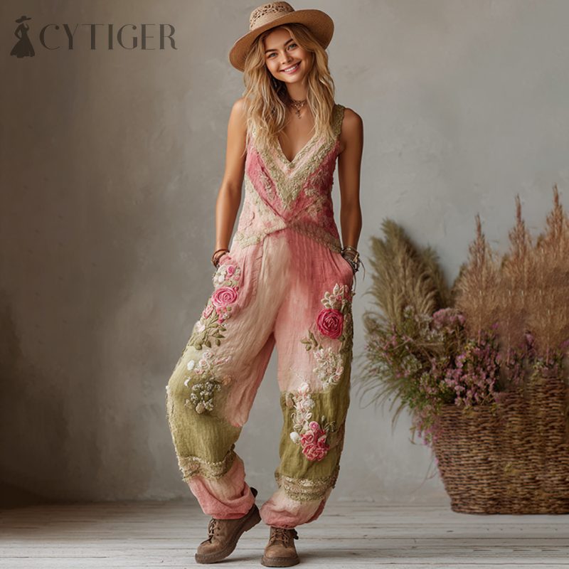 Love & Health Collection Retro Western Women Style Vintage Rose And Floral Patchwork Art Cotton Linen Jumpsuit