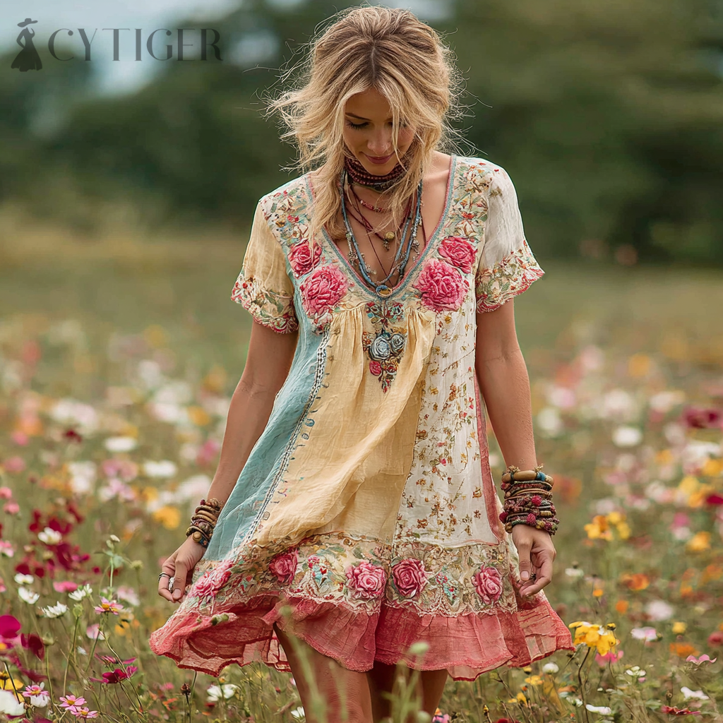 Women's Vintage Roses Embroidered Art Linen Short Dress
