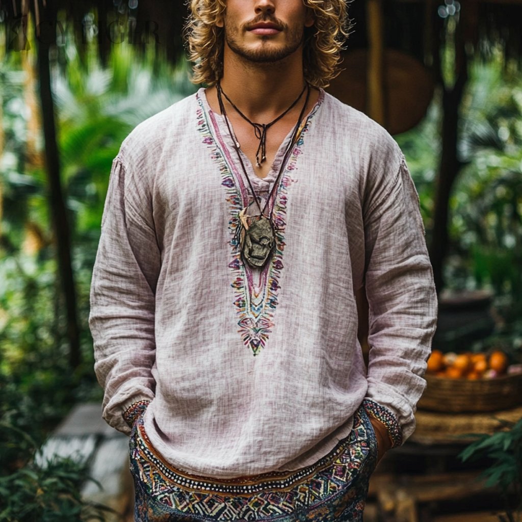 Men's Bohemian Holiday Style Vintage Linen Printed Casual Long Sleeve Top