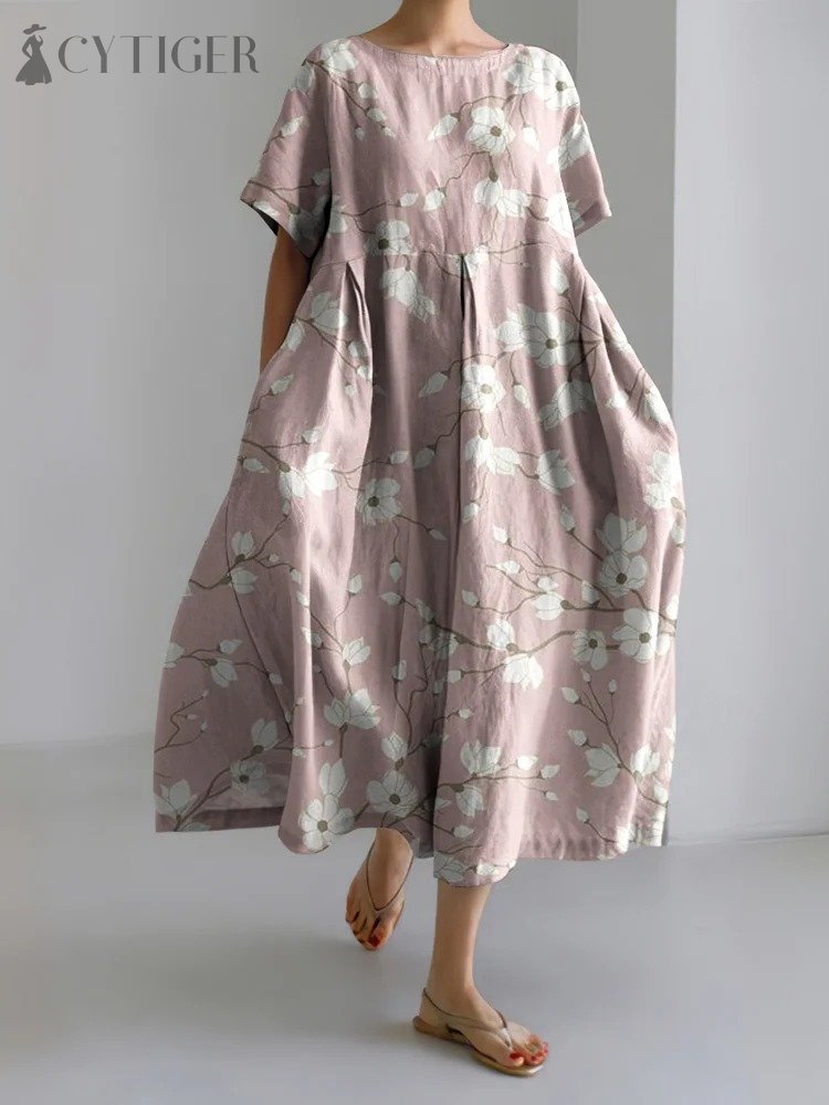 Pink Floral Art Print Linen Blend Maxi Dress