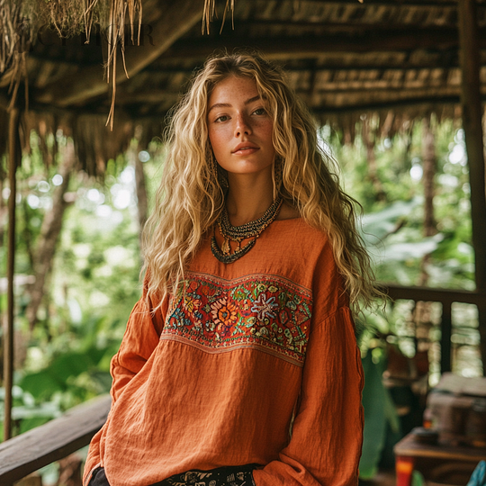 Retro Bohemian Art Embroidery Print Cotton And Linen Blend Loose Blouse