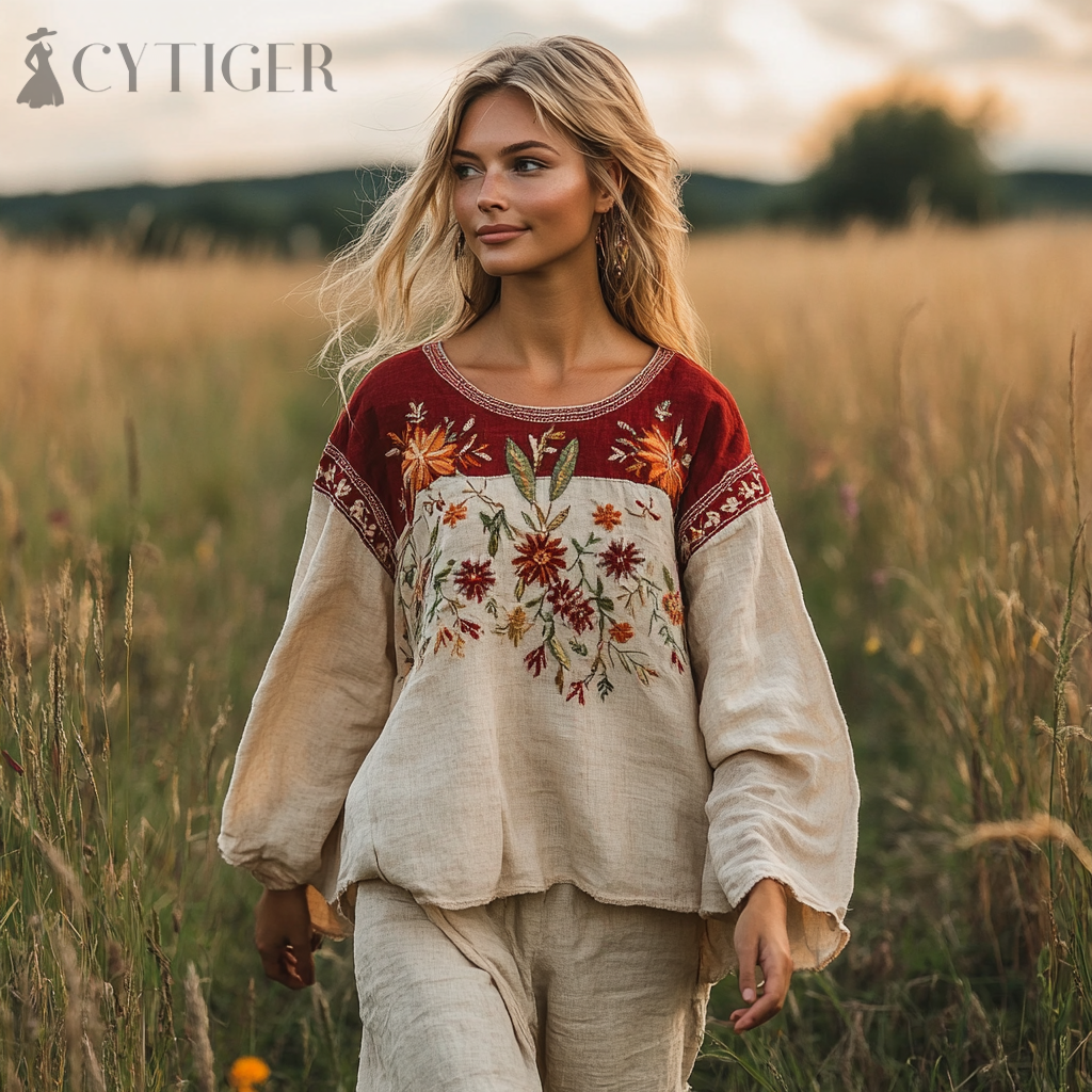 Retro Bohemian Floral Embroidery Art Linen Blend Loose Blouse