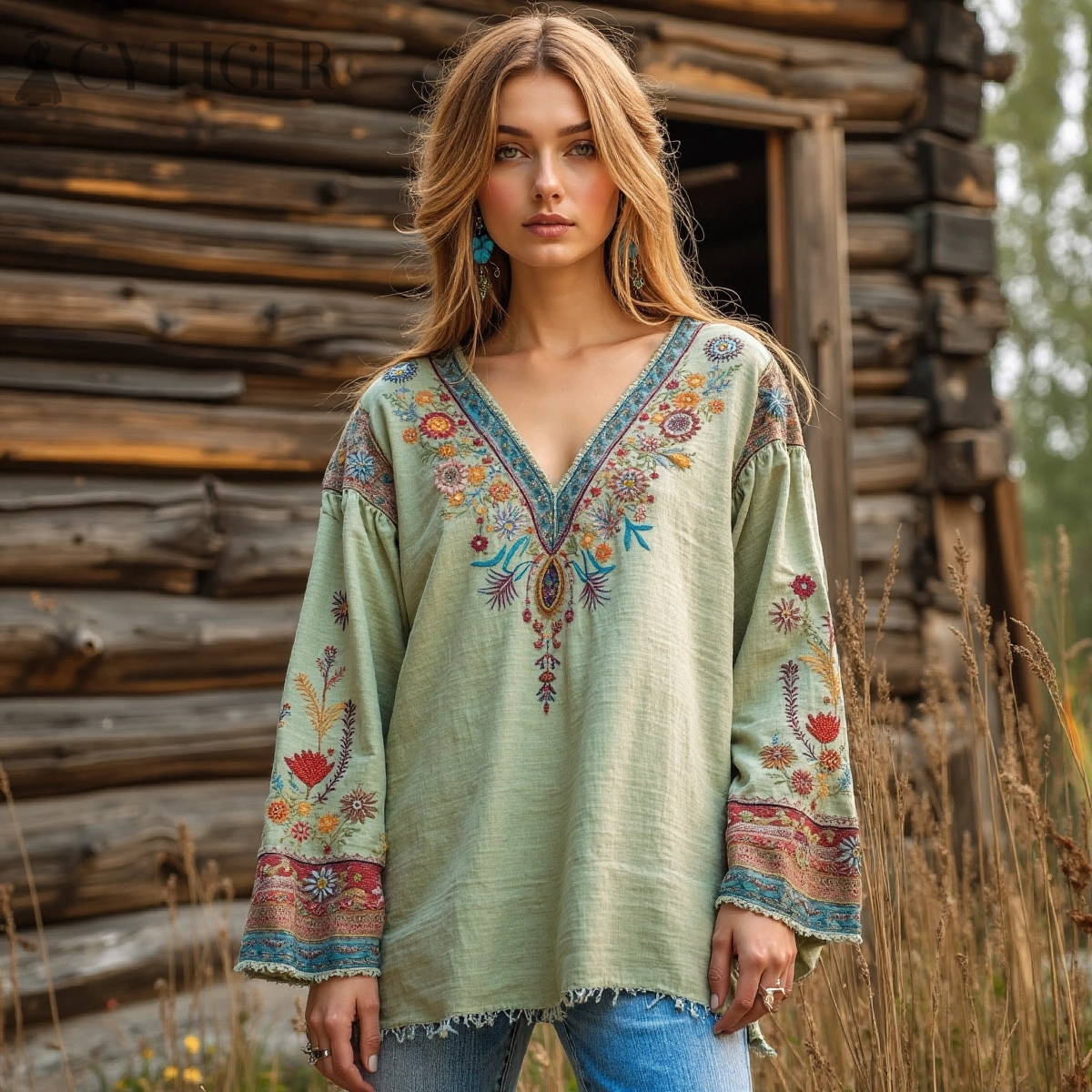 Retro Bohemian Tribal Art Embroidery Print Cotton And Linen V-neck Loose Shirt
