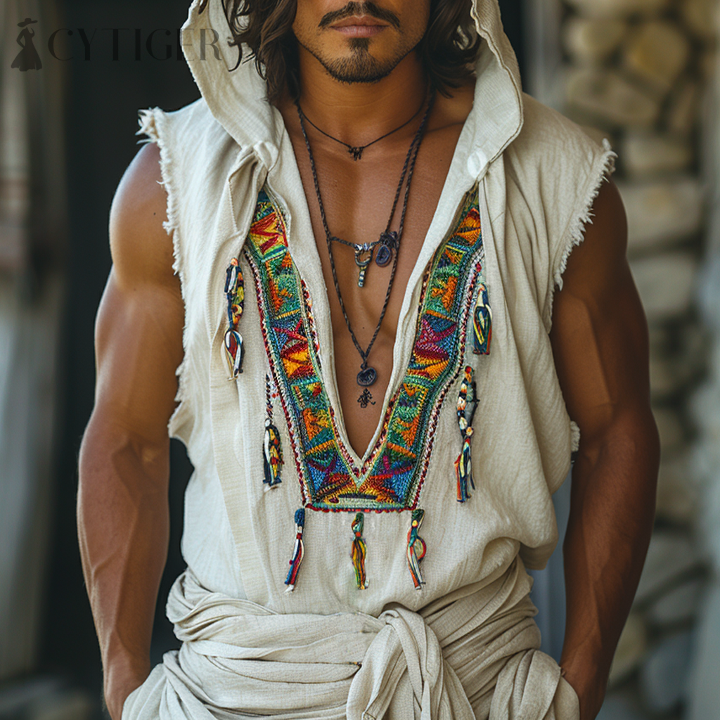 Retro Men's Ethnic V-Neck Sleeveless Linen Hoodie Casual Retro Tribal Top Bohemian Style Sleeveless Tank Top