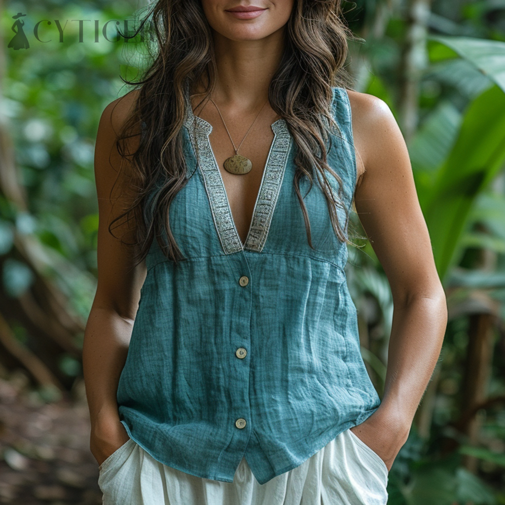 Simple V-neck Sleeveless Shirt, Comfortable And Breathable Linen Top