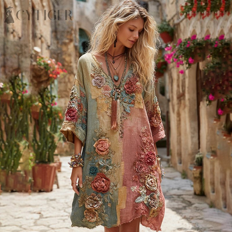 The Ice Cream Collection Women's Classic Bohemian Floral And Rose Gradient Art Linen Long Sleeve Midi Dress