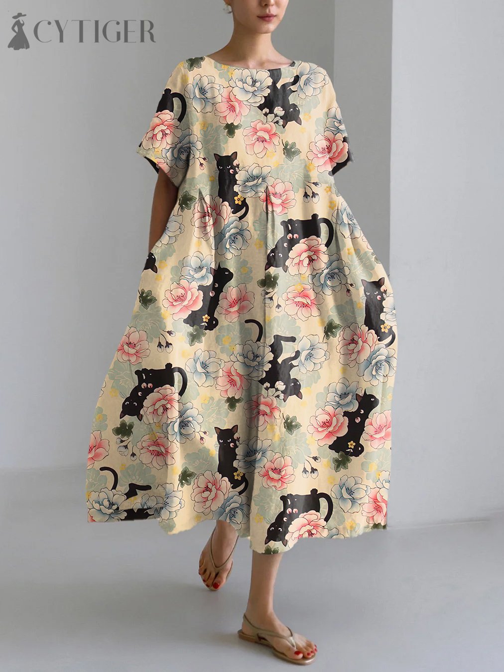 Vintage Black Cat Floral Pattern Linen Blend Maxi Dress