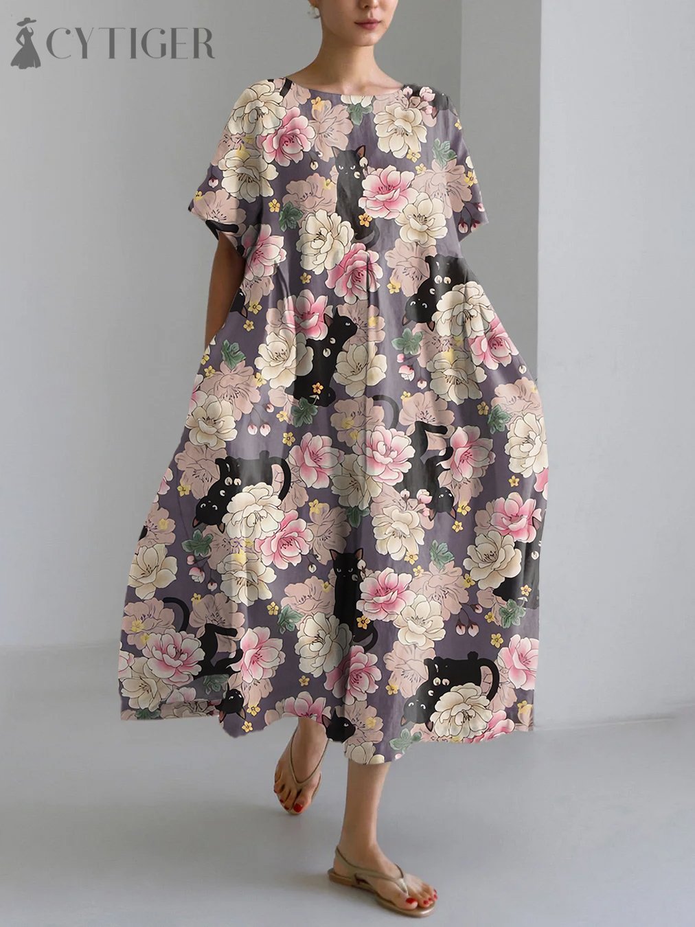 Vintage Black Cat Floral Pattern Linen Blend Maxi Dress