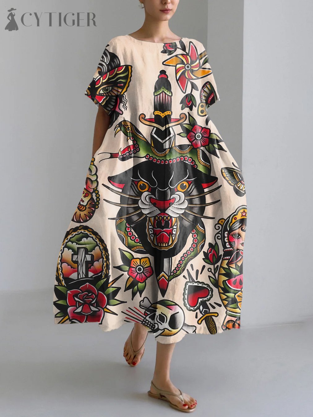Vintage Black Panther Tattoo Pattern Linen Blend Maxi Dress