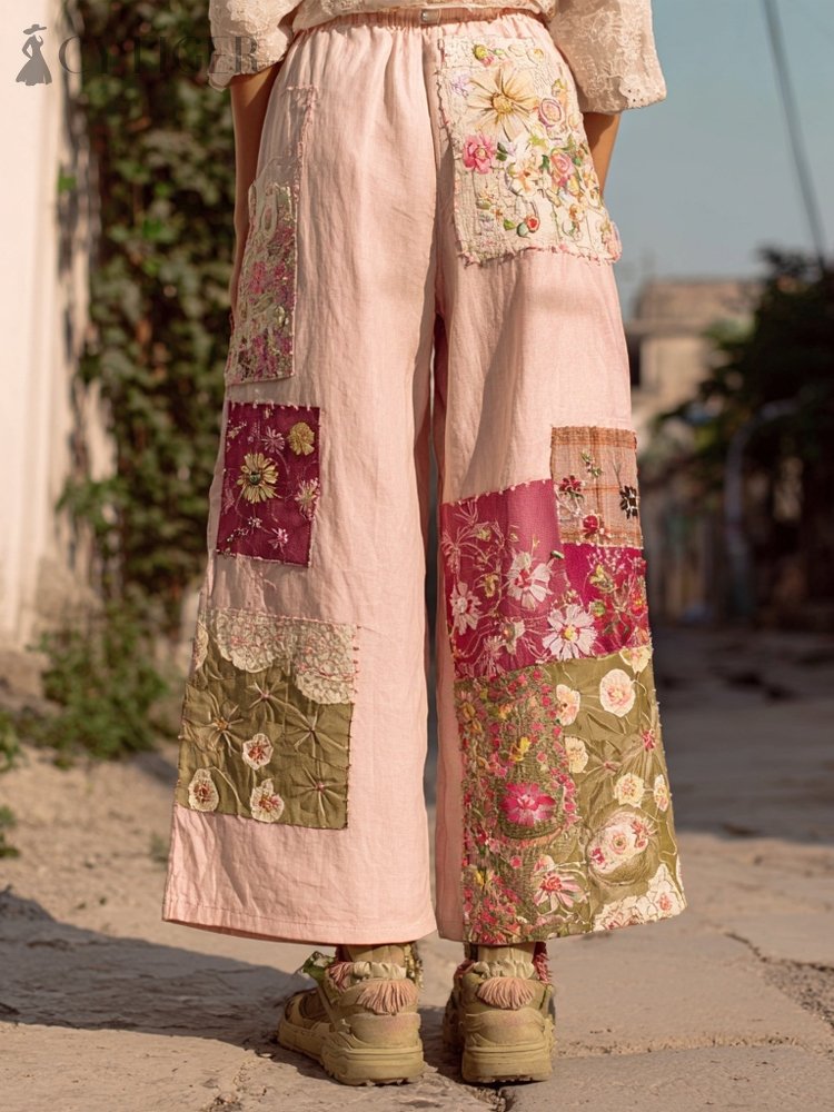 Vintage Boho Floral Embroidered Patchwork Linen Trousers