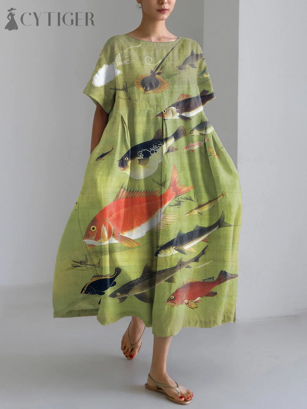 Vintage Fish Art Print Linen Blend Maxi Dress