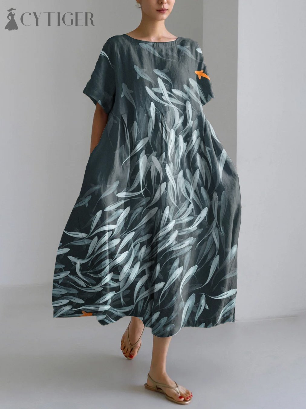 Vintage Japanese Art Fish Print Linen Blend Maxi Dress