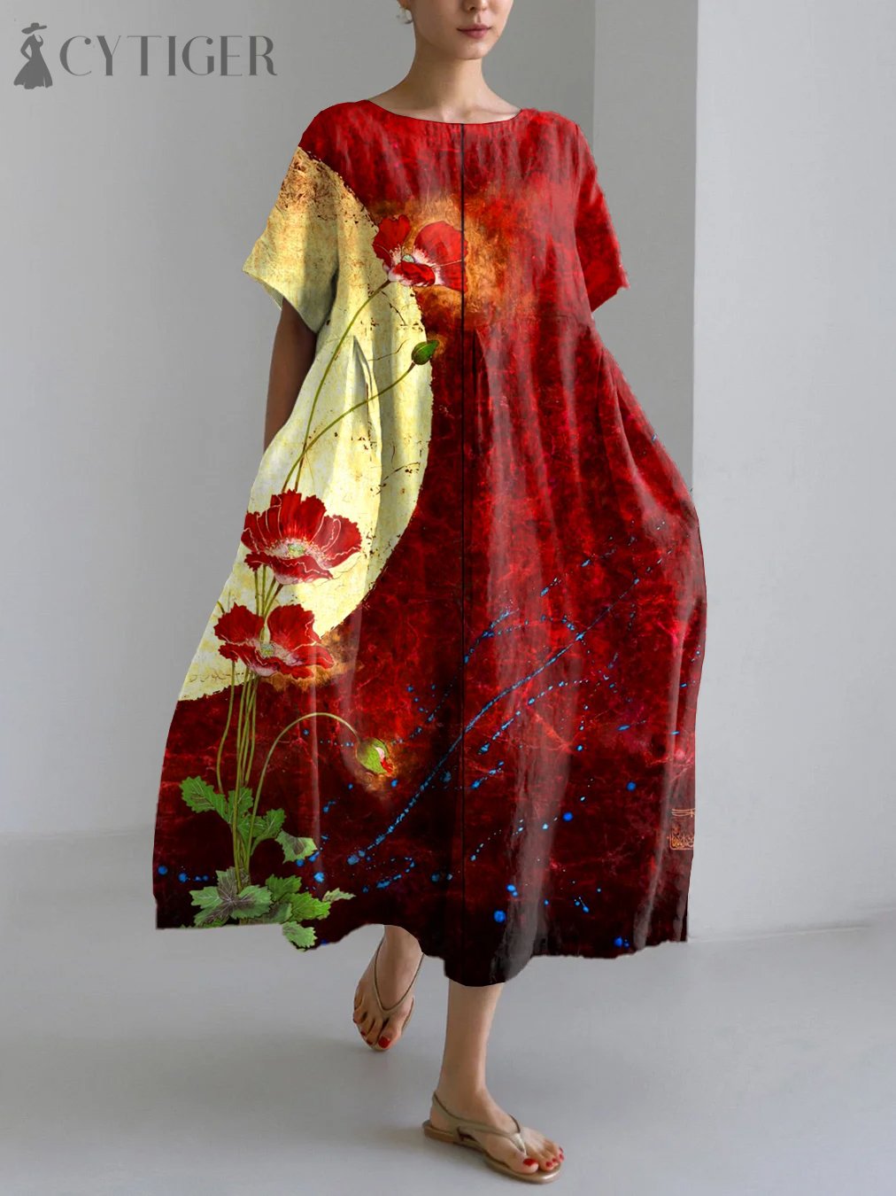 Vintage Japanese Art Flower And Moon Print Linen Blend Maxi Dress