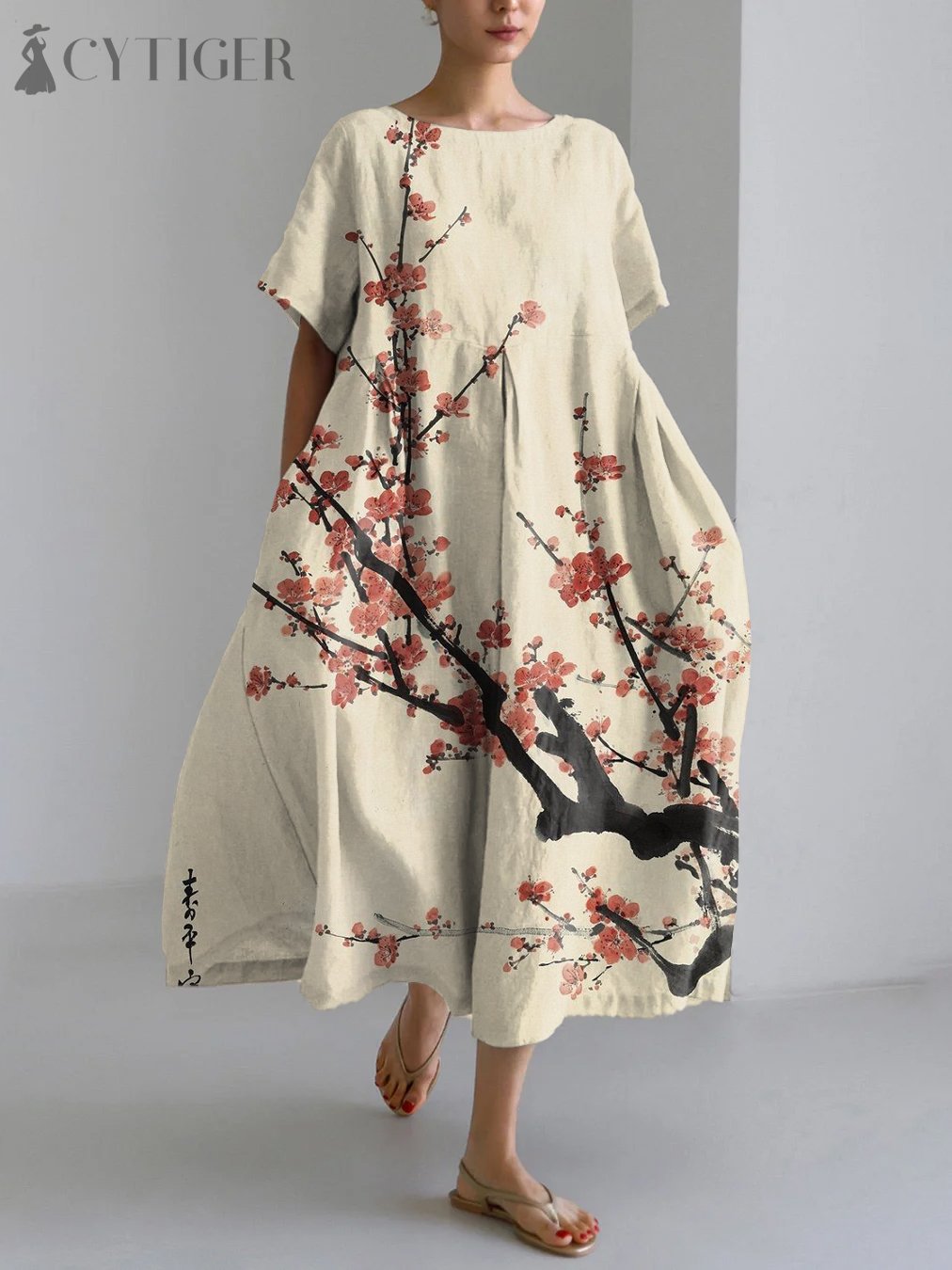 Vintage Japanese Art Flower Pattern Linen Blend Maxi Dress