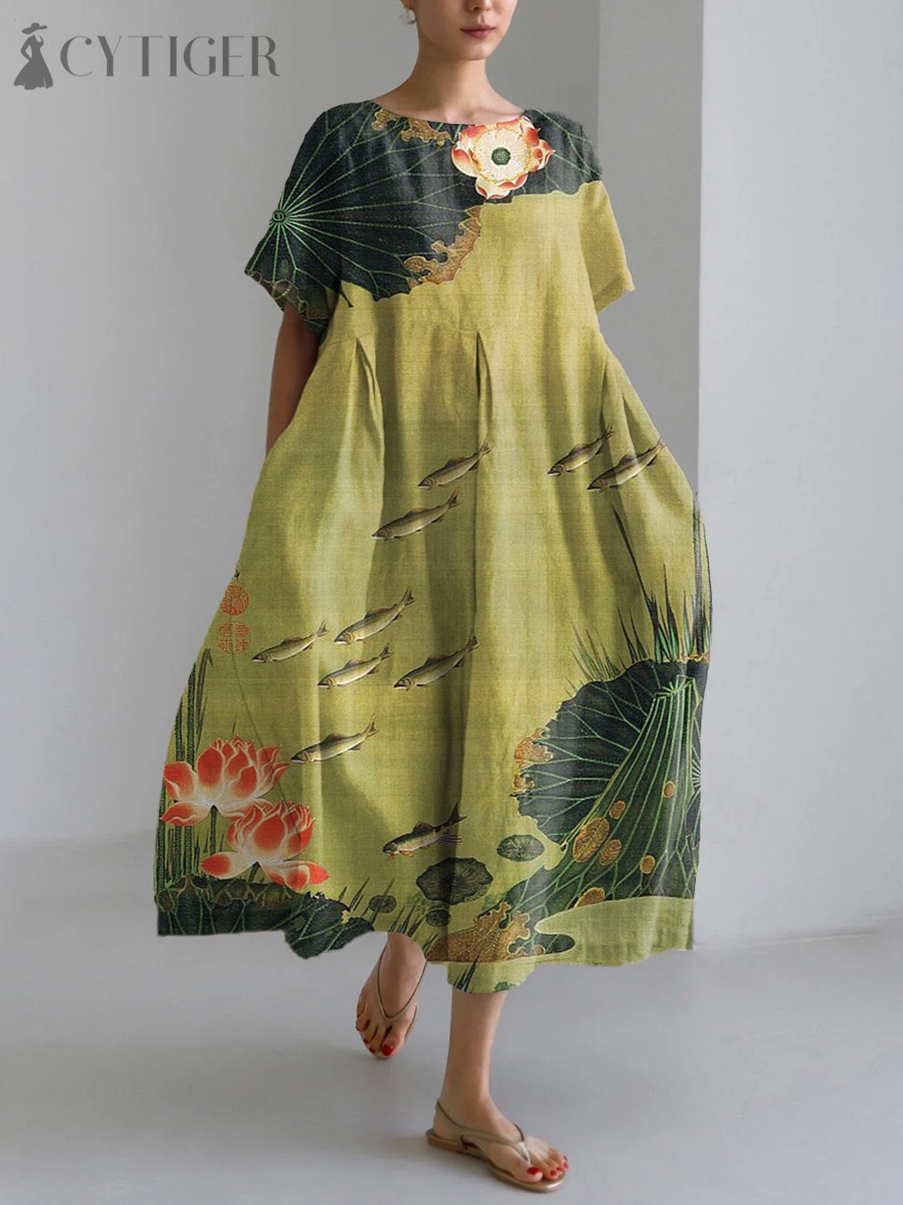 Vintage Japanese Art Print Linen Blend Maxi Dress