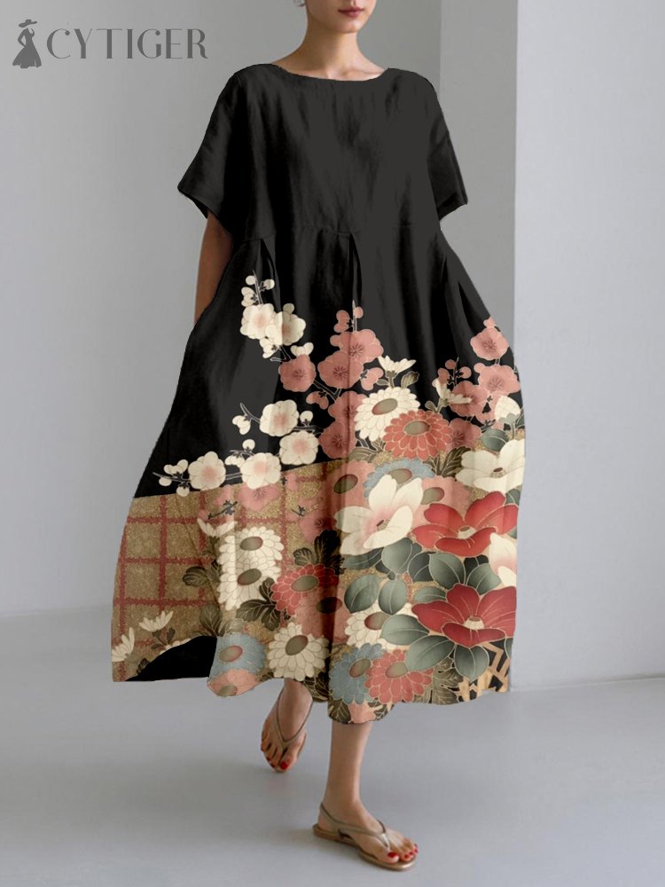 Vintage Japanese Flower Art Linen Blend Maxi Dress