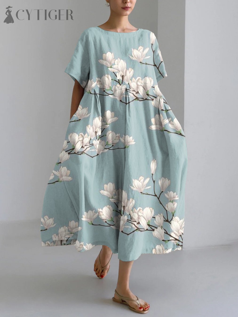 Vintage Japanese Magnolia Flower Print Linen Blend Maxi Dress