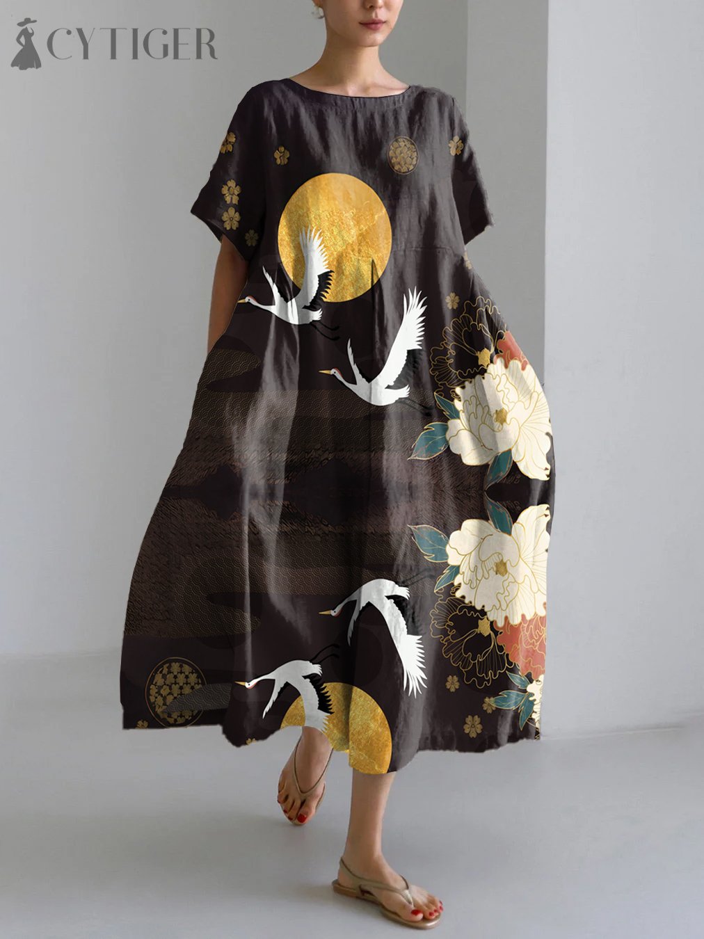Vintage Japanese Peony Crane Print Linen Blend Maxi Dress
