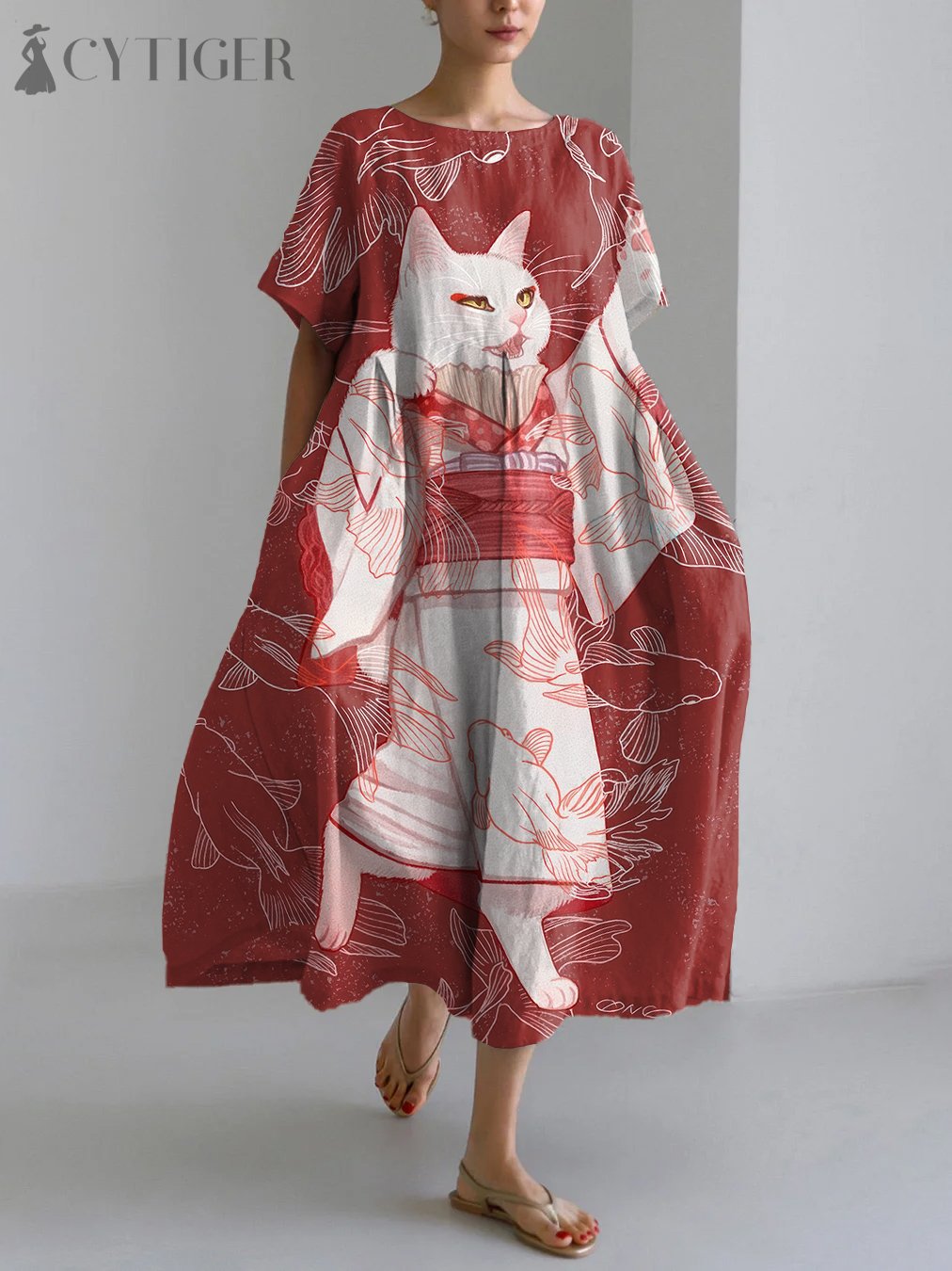 Vintage Kimono Cat Pattern Linen Blend Maxi Dress