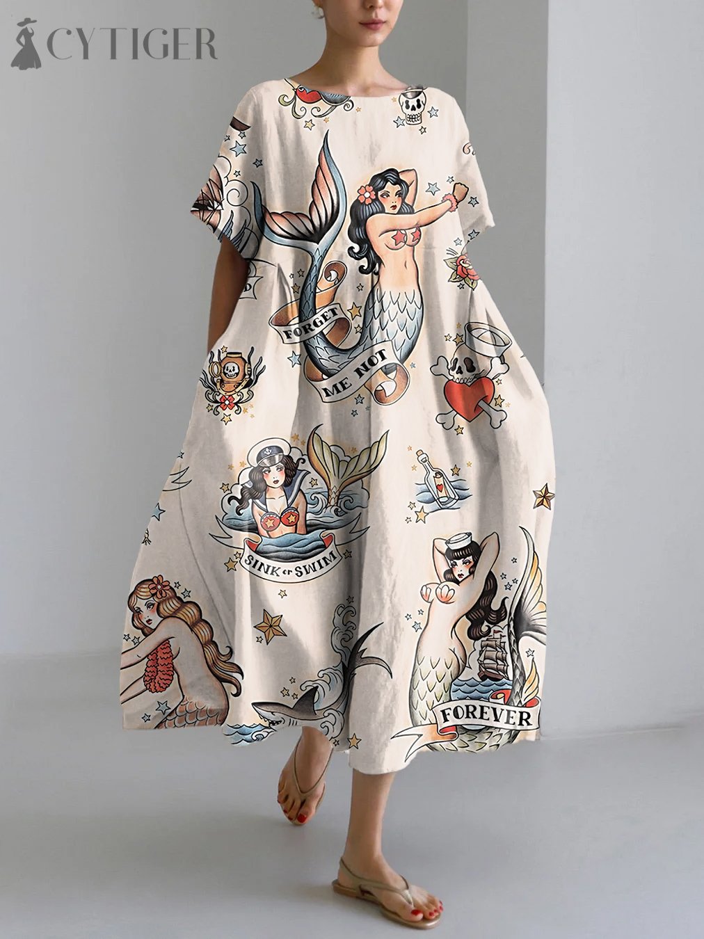 Vintage Mermaid Pattern Linen Blend Maxi Dress