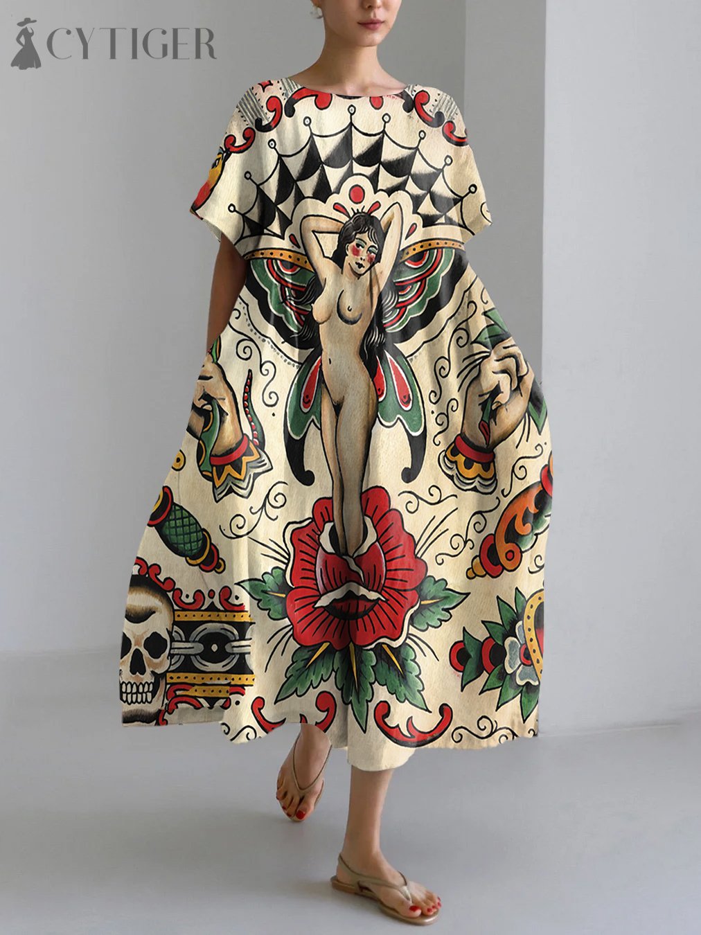 Vintage Tattoo Pattern Linen Blend Maxi Dress