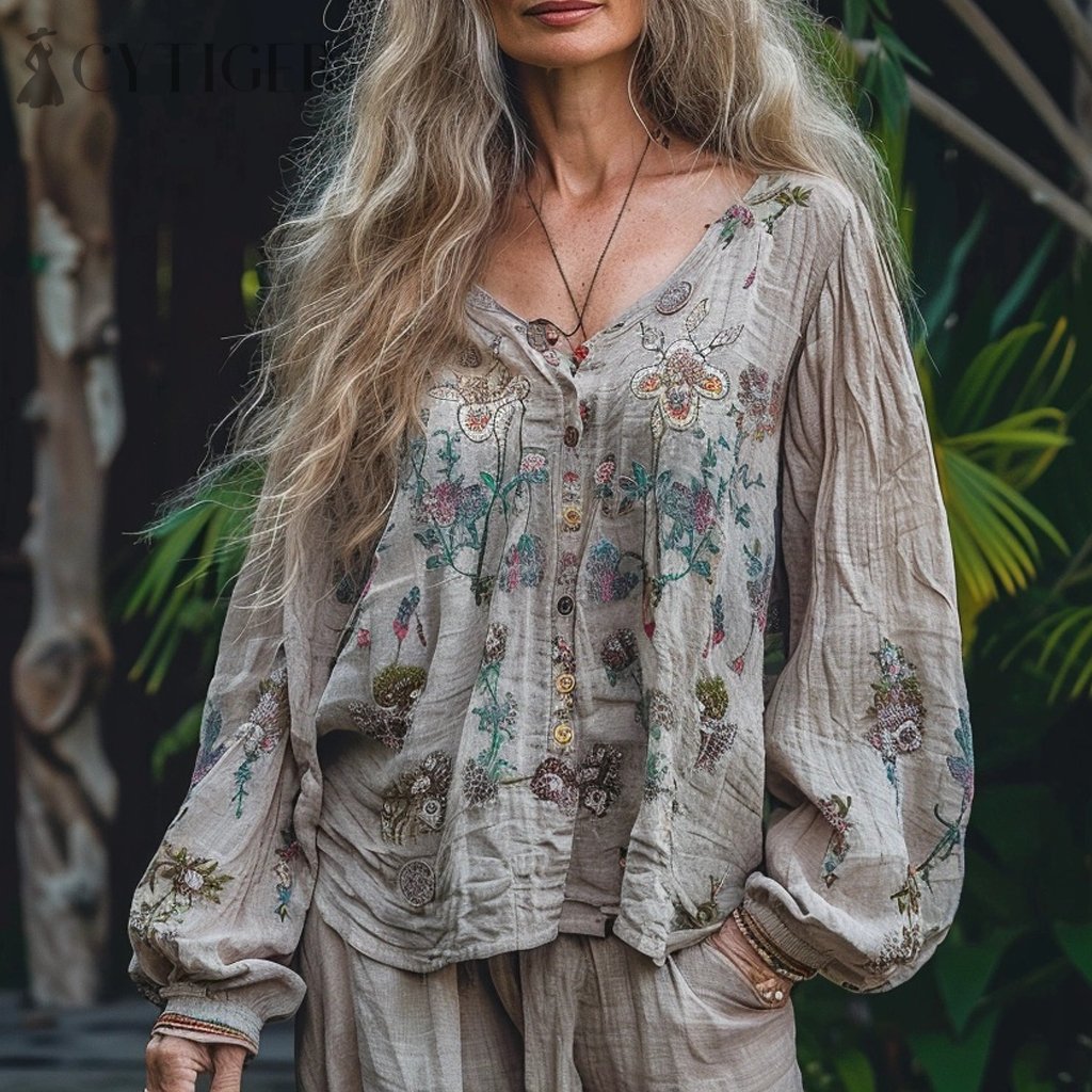 Women's Bohemian Ethnic Floral V-necka Casual Loose Shirt
