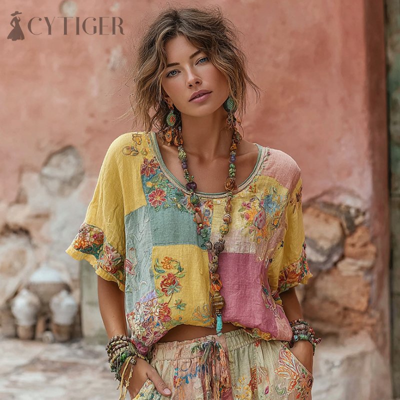 Women's Bohemian Floral Embroidery Patchwork Art Round Neck Linen Blend T-shirt