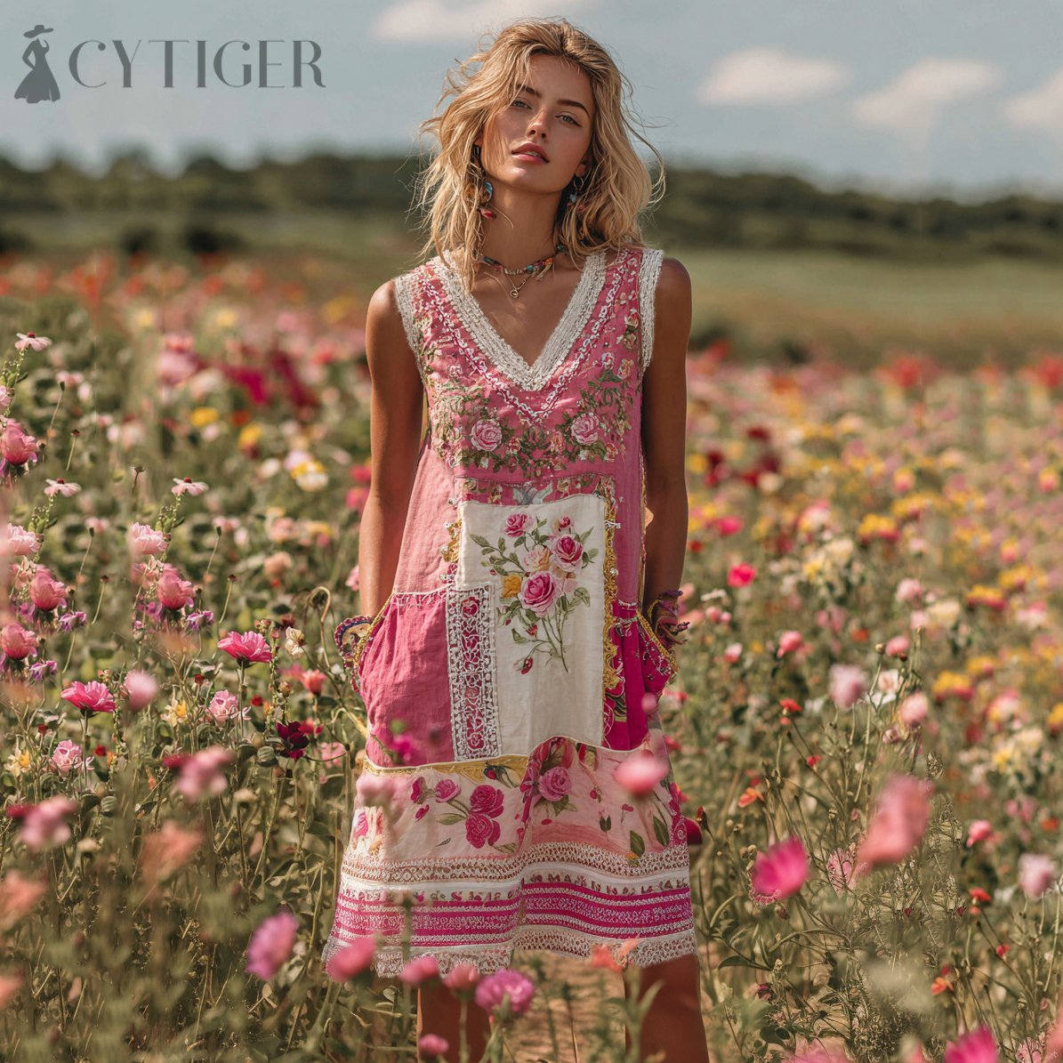 Women's Embroidered Rose Patchwork Midi Dress