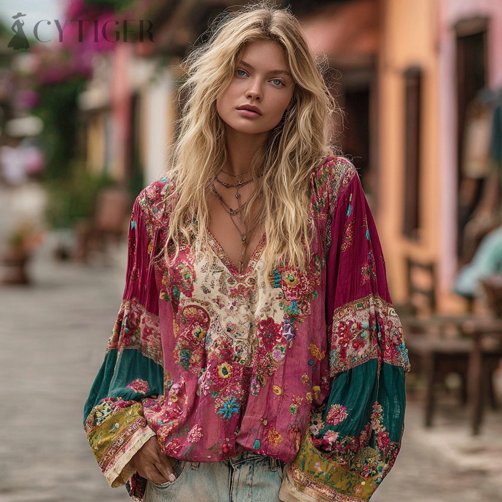 Women's Floral Embroidery Boho Colorblock Art Linen Blend V-neck Shirt