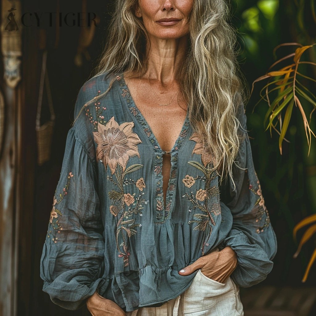 Women's Linen Bohemian Ethnic Simple Casual Loose Floral Shirt