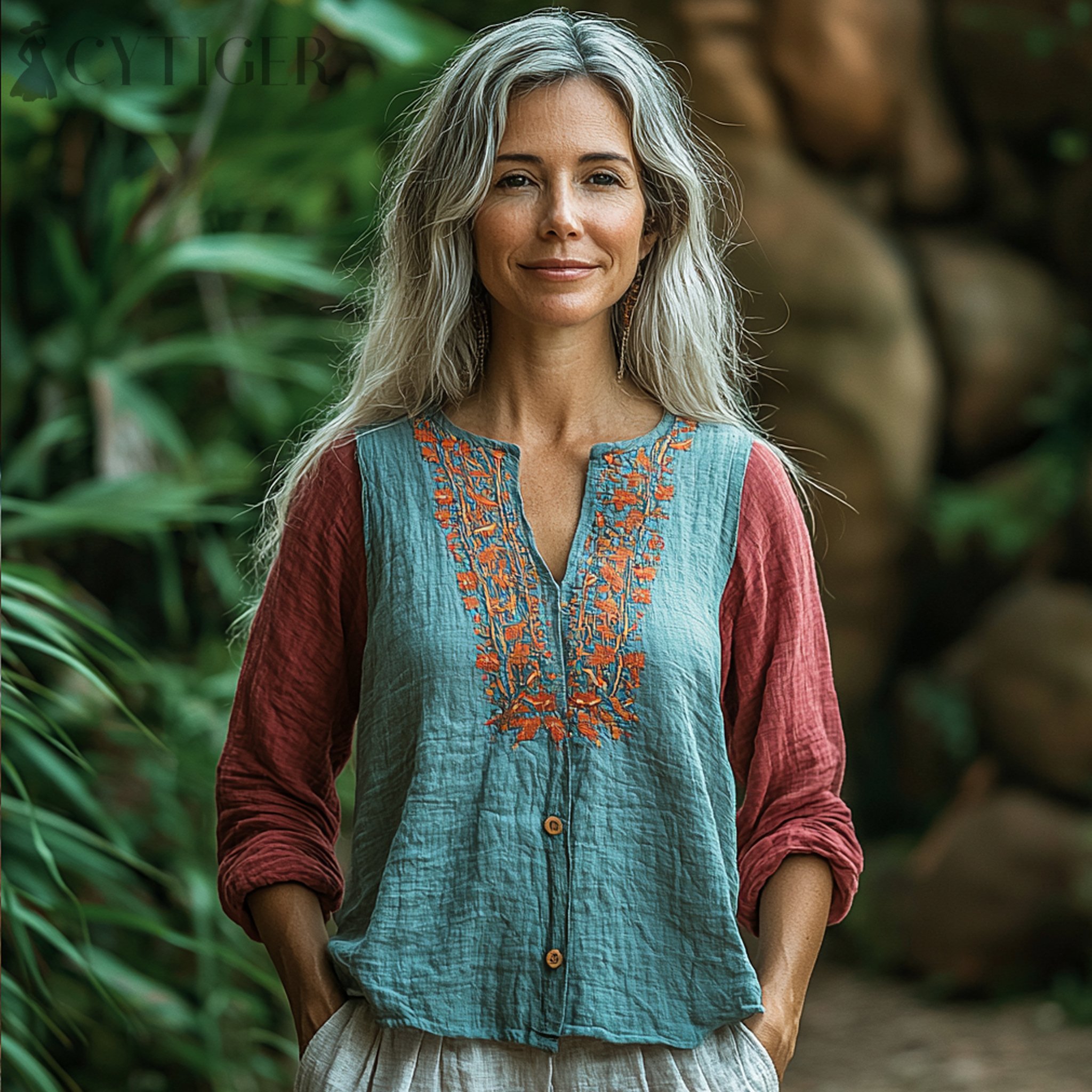 Women's Linen Contrast Color Panel Bohemian Casual Shirt