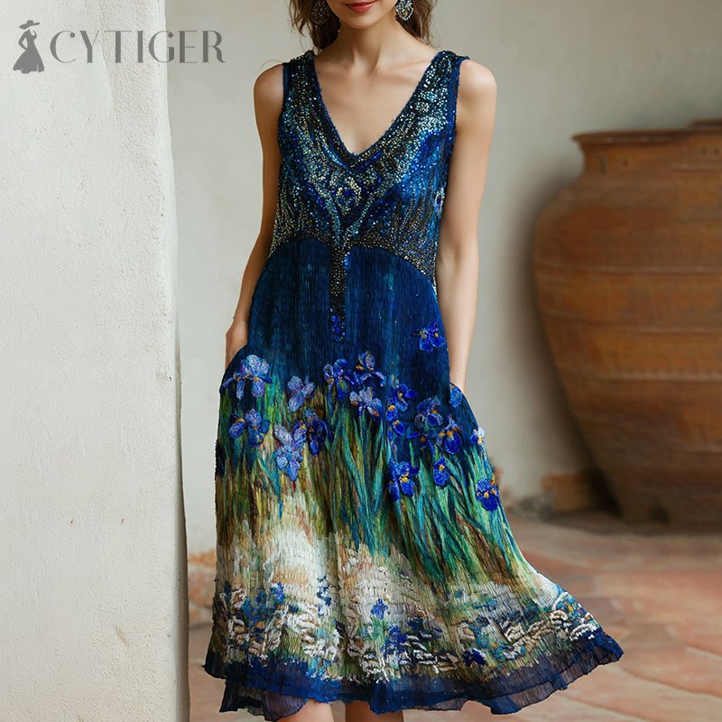 Women's Oil Painting Embroidered Iris Sequined Midi Dress